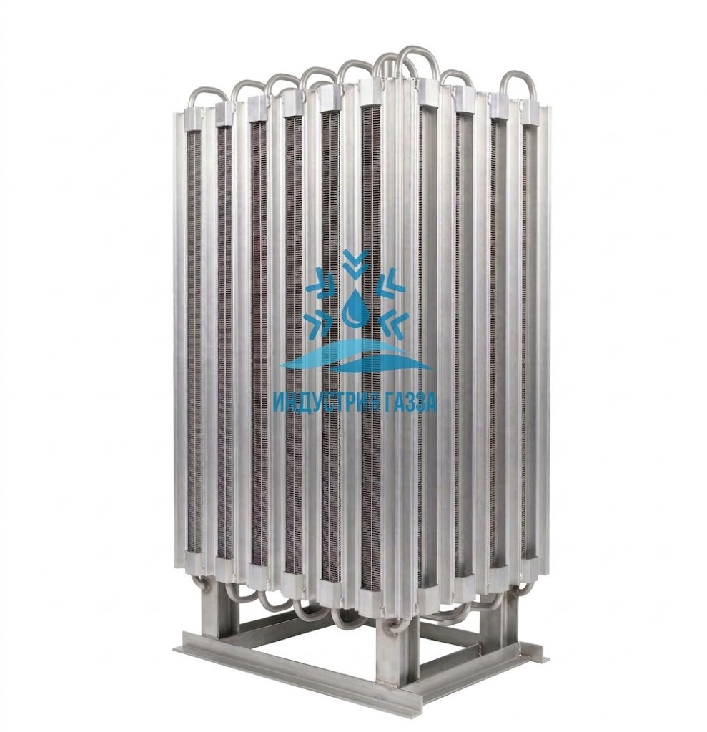 Атмосферный испаритель выглядит как рама с параллельно установленными трубами из нержавеющей стали, в которых под воздействием температуры атмосферного воздуха происходит изменение агрегатного состояния газа. Наличие рёбер увеличивает площадь теплообмена. Вертикальная установка занимает меньше места и отличается большей производительностью по сравнению с горизонтальной. На выходе, входе в испаритель сделаны фланцевые или резьбовые соединения. Контрольно -измерительные, предохранительные устройства монтируют исходя из требований заказчика.